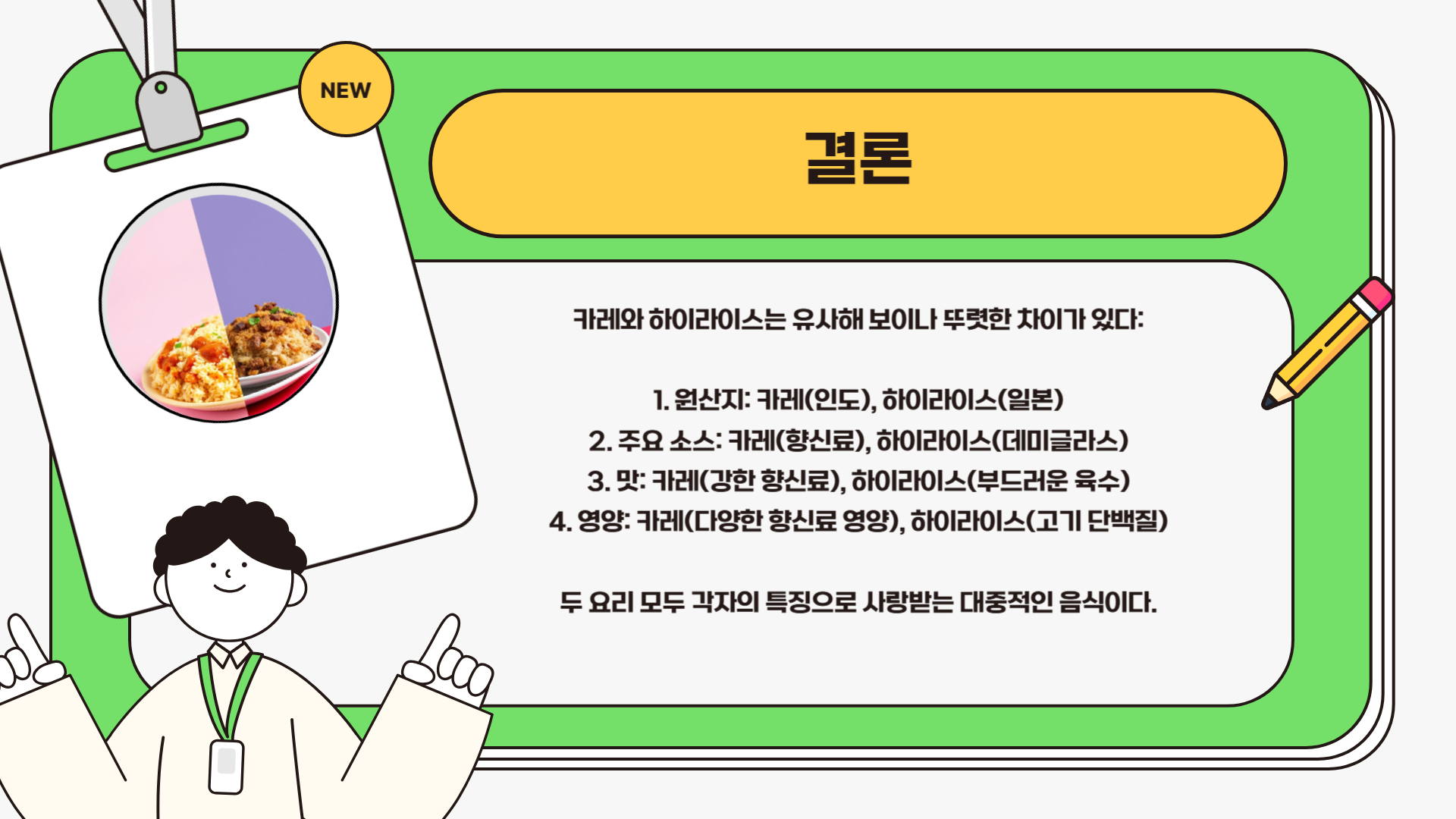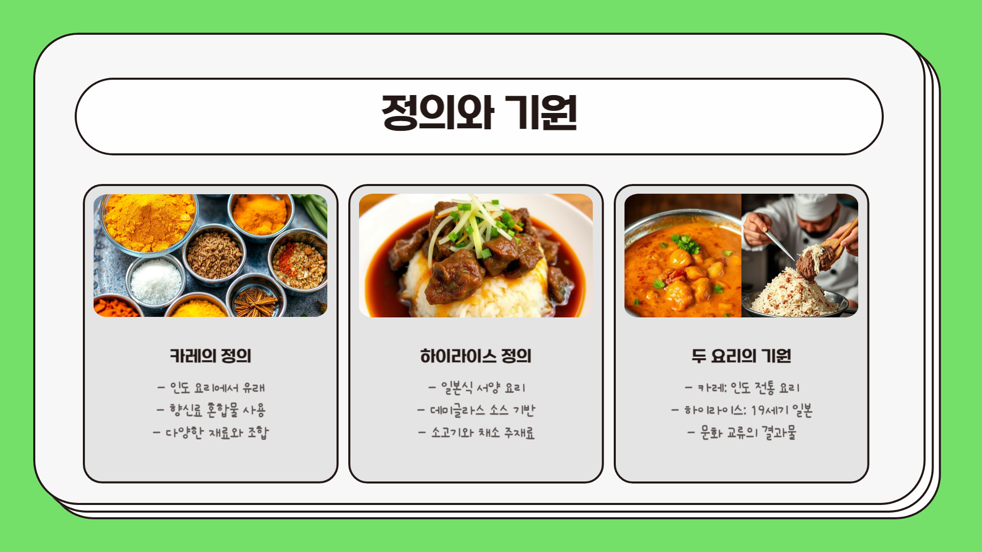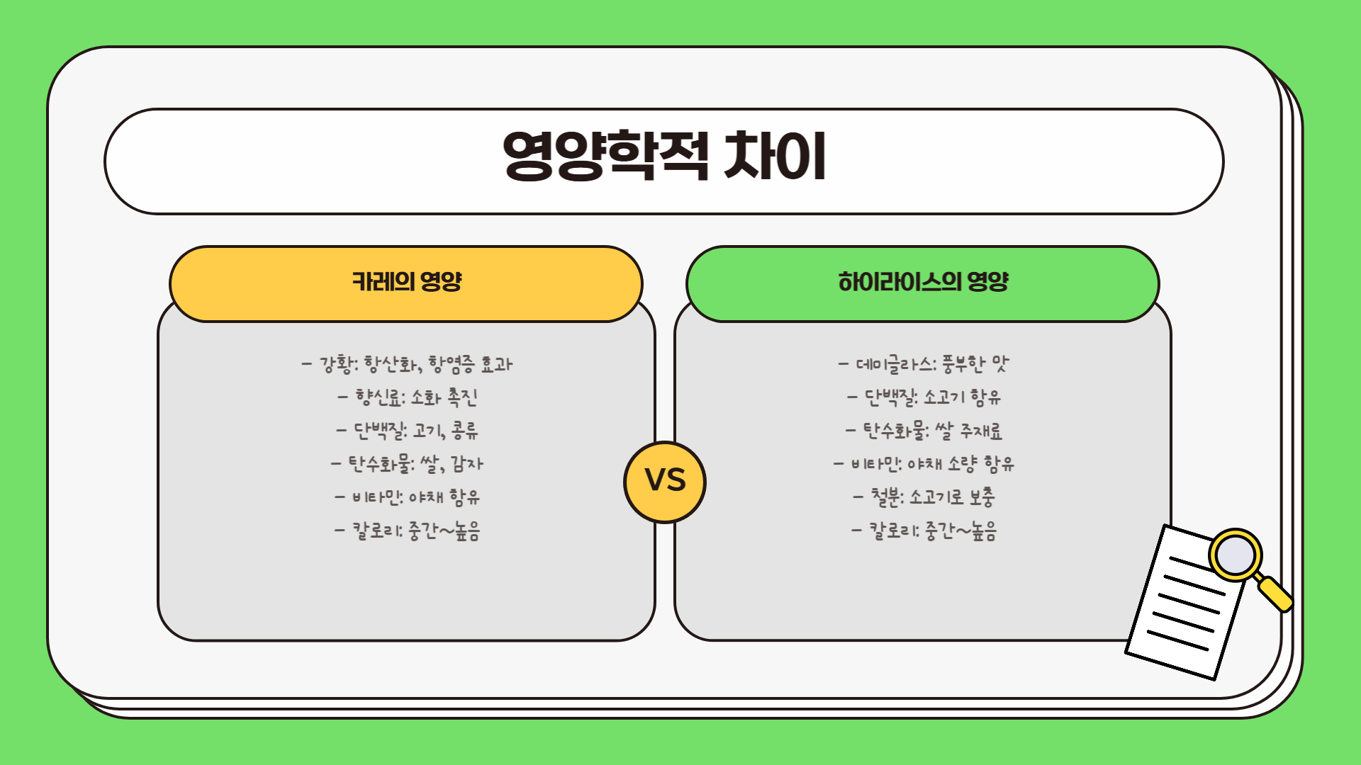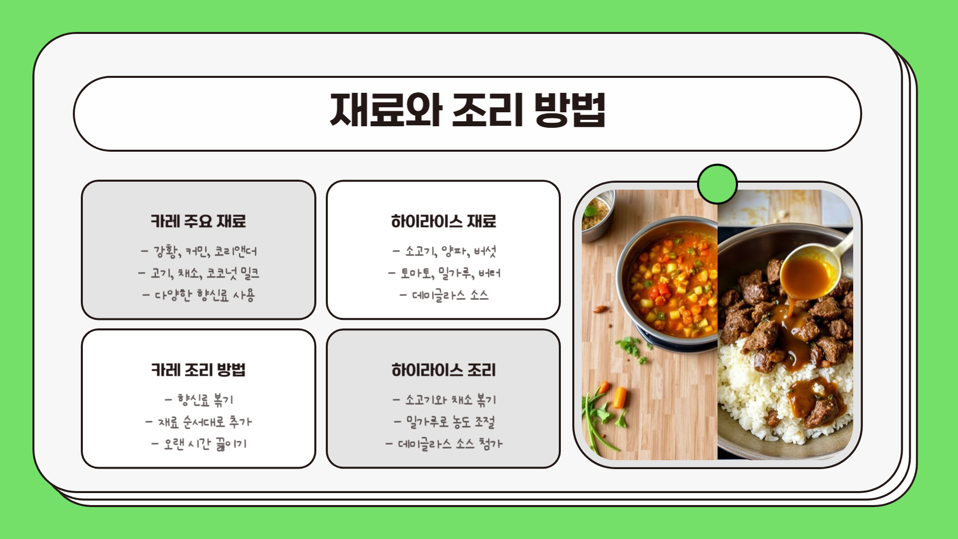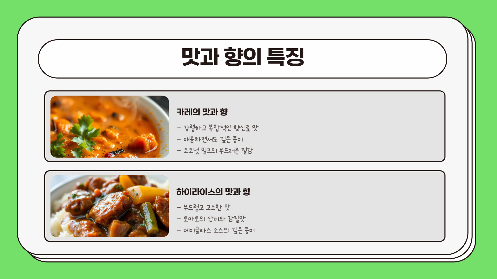 카레와 하이라이스는 비슷한 형태를 가지고 있지만, 향신료의 풍미, 소스의 농도, 그리고 재료 구성에서 차이가 있습니다. 카레는 강렬하고 풍미가 강한 반면, 하이라이스는 부드럽고 달콤한 맛으로 누구나 쉽게 즐길 수 있는 요리입니다.