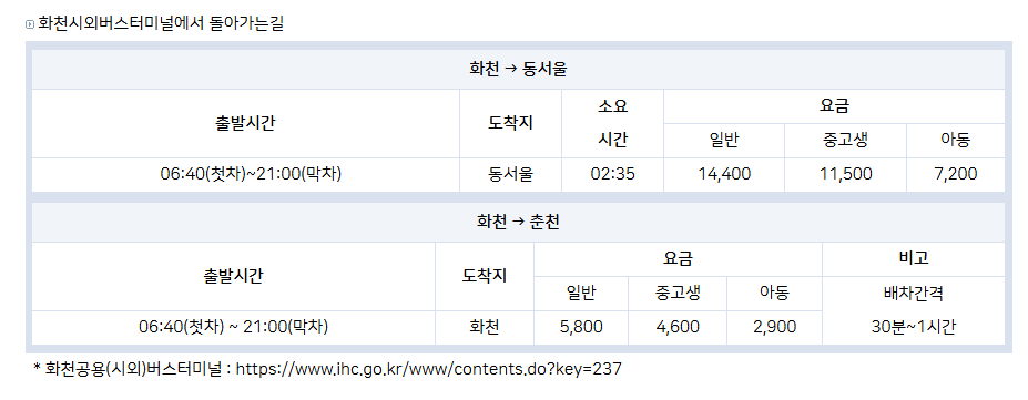 - 노상10: 화천공영버스터미널 옆 ↔ 낭천가든 옆