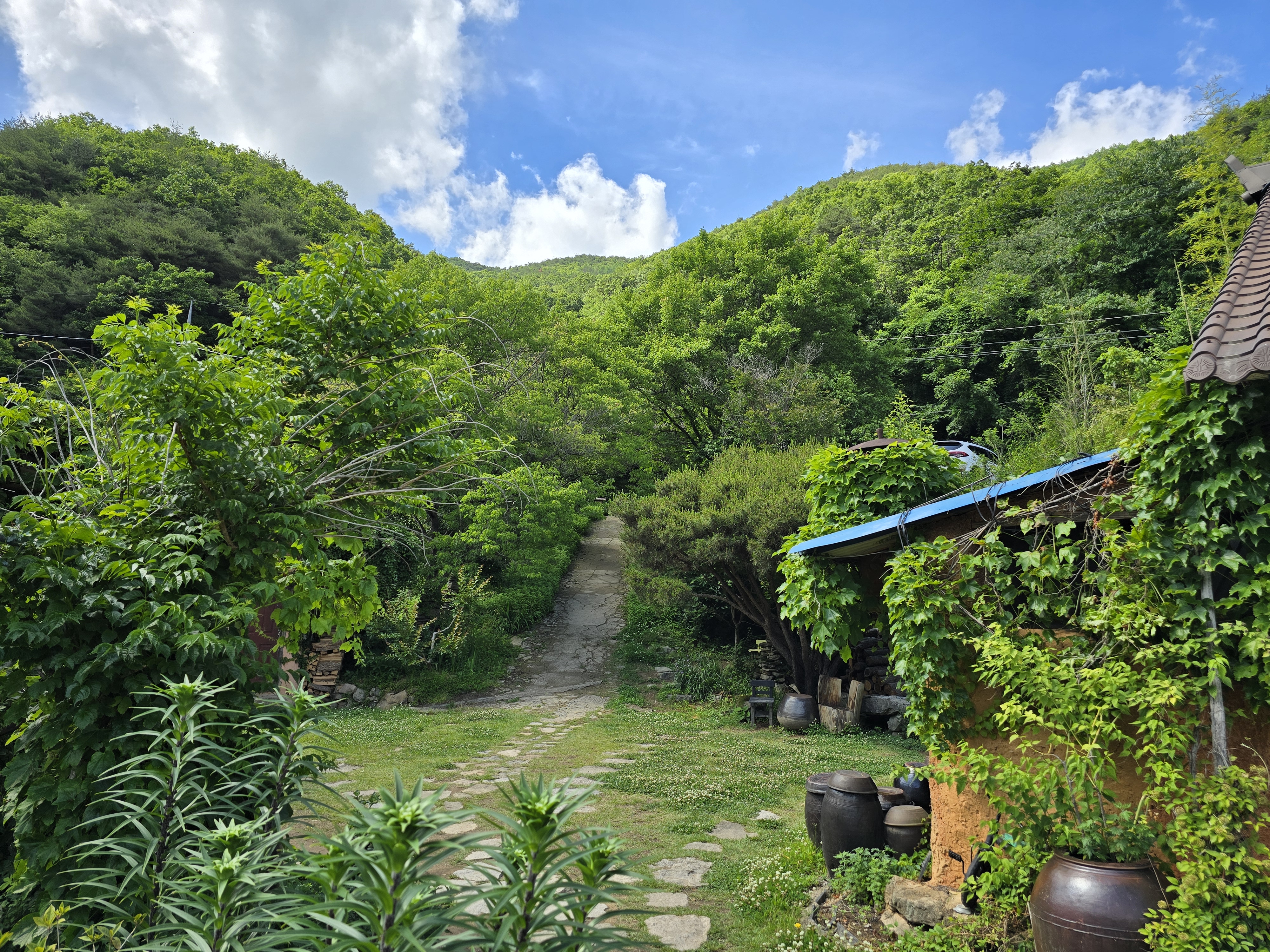 안쪽에서 바라본 입구 입니다. 입구에 들어오면 이렇게 내리막길이 있어요. 평소에는 괜찮은데 비가 오면 좀 미끄러울 것 같으니 조심 하시기 바랍니다.