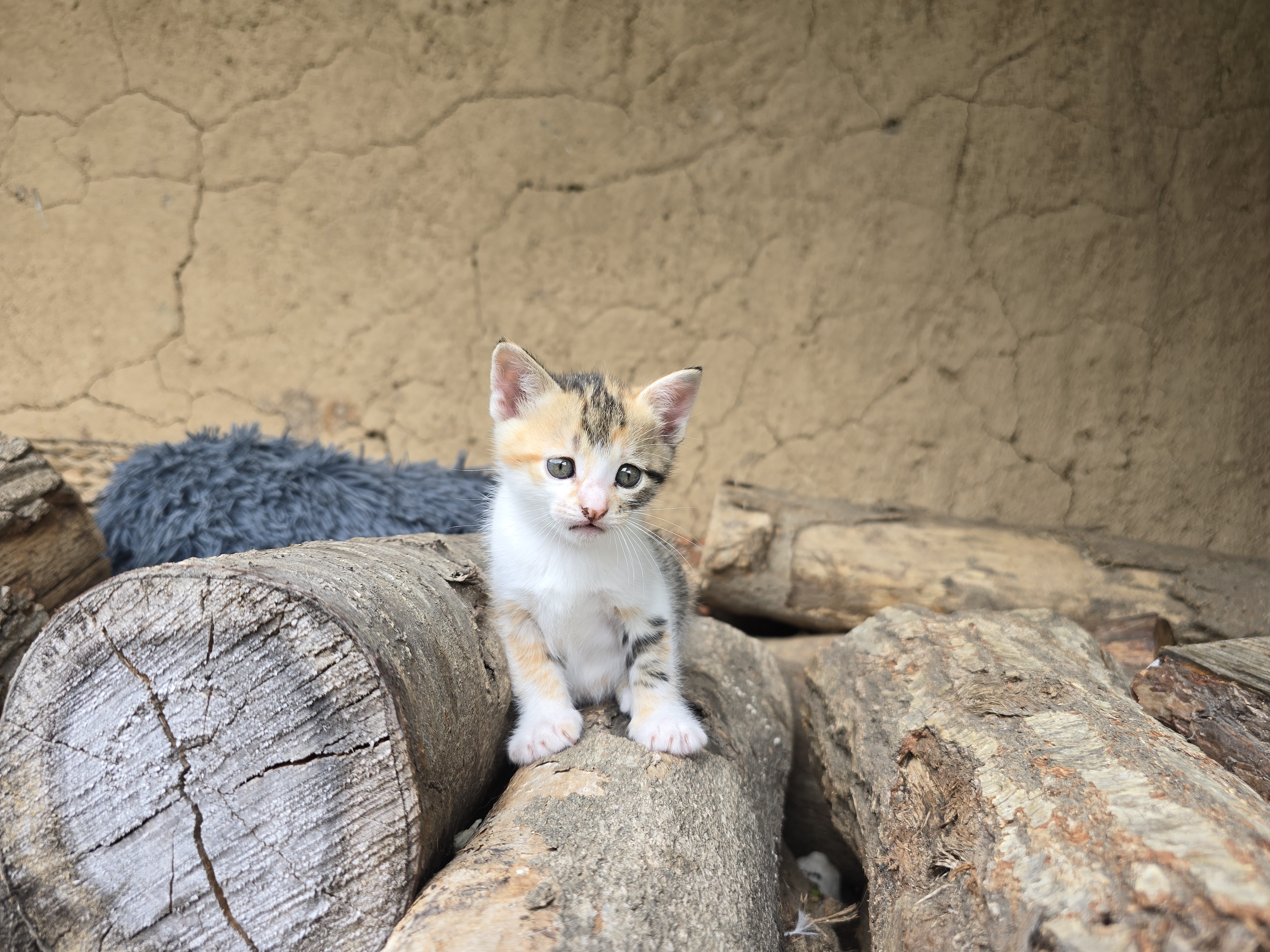 이 아이가 흰 고양이의 새끼 고양이인데 새끼고양이는 2마리가 있는데 한마리는 장작더미 뒤에서 자고있더라고요. ㅎ