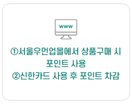 ①우먼업몰에서 온라인 상품구매를 통한 포인트 사용 ②우먼업몰 이외 구직활동에 필요한 비용 본인명의 신한카드로 결제(온·오프라인) → 우먼업몰 접속하여 포인트 차감 신청 → 신용카드의 경우 미청구 처리, 체크카드 경우 선출금 후입금 처리 예정