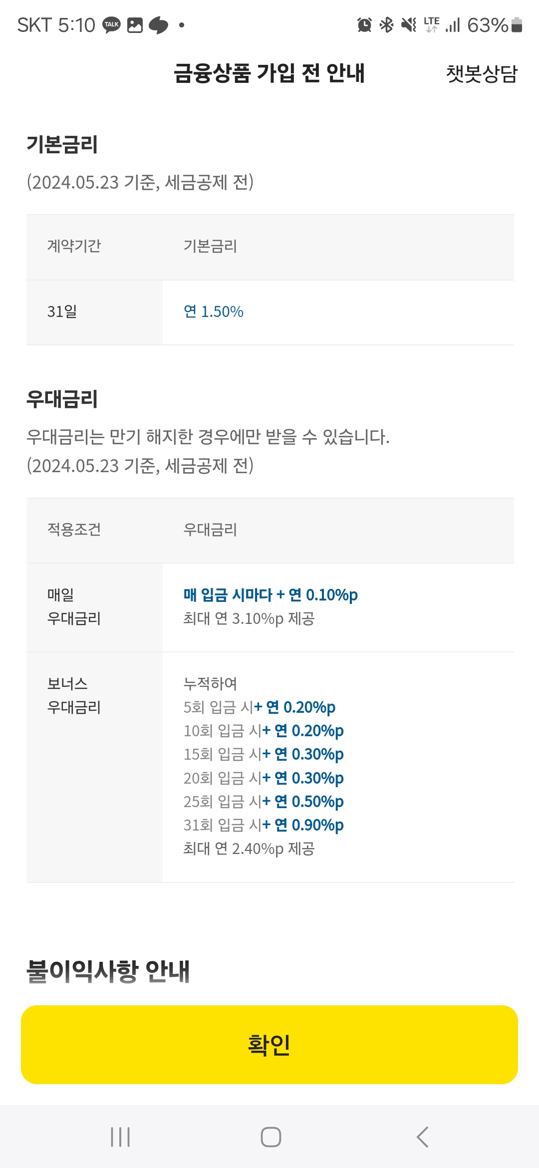 기본금리는 31일간 연 1.5%입니다. 만기시 최대 7% 금리라고 되어있었죠?