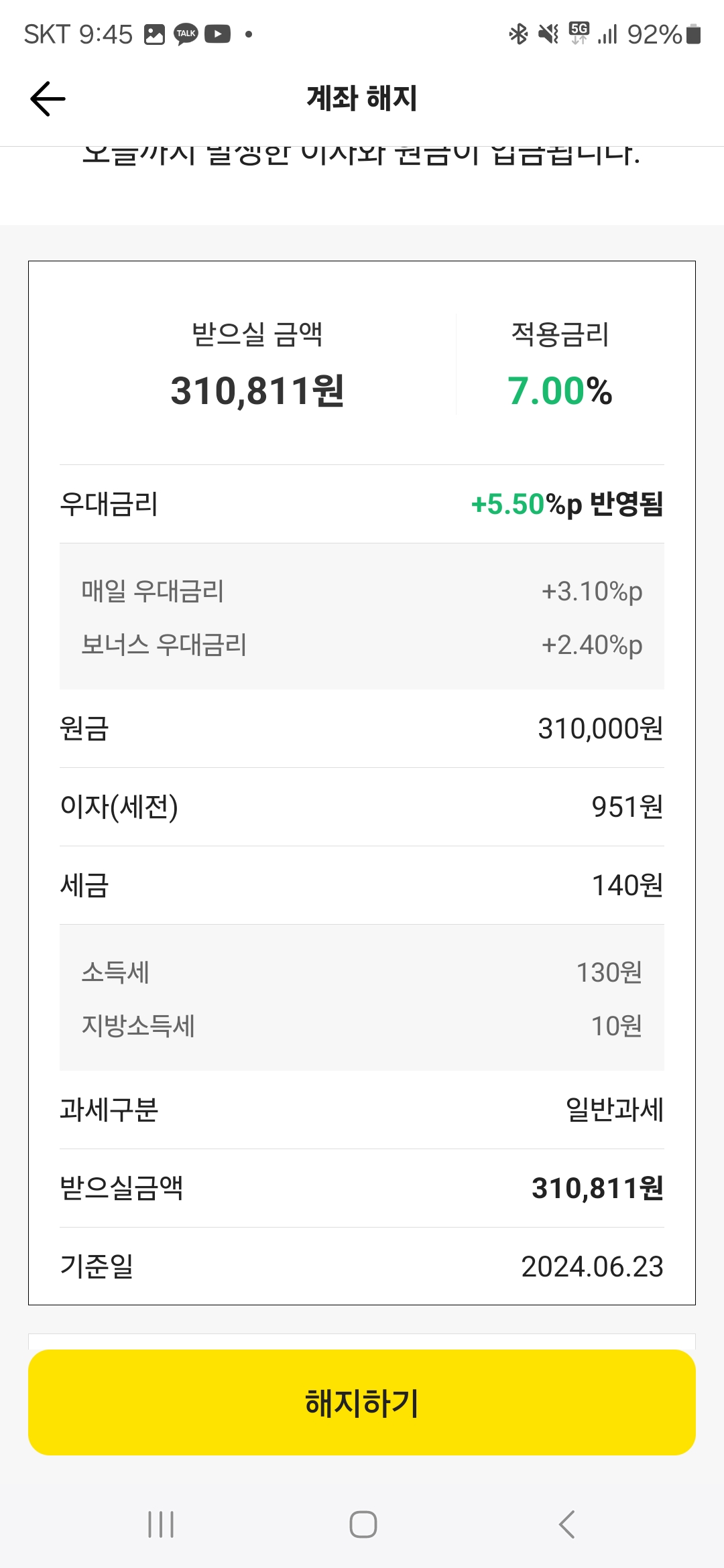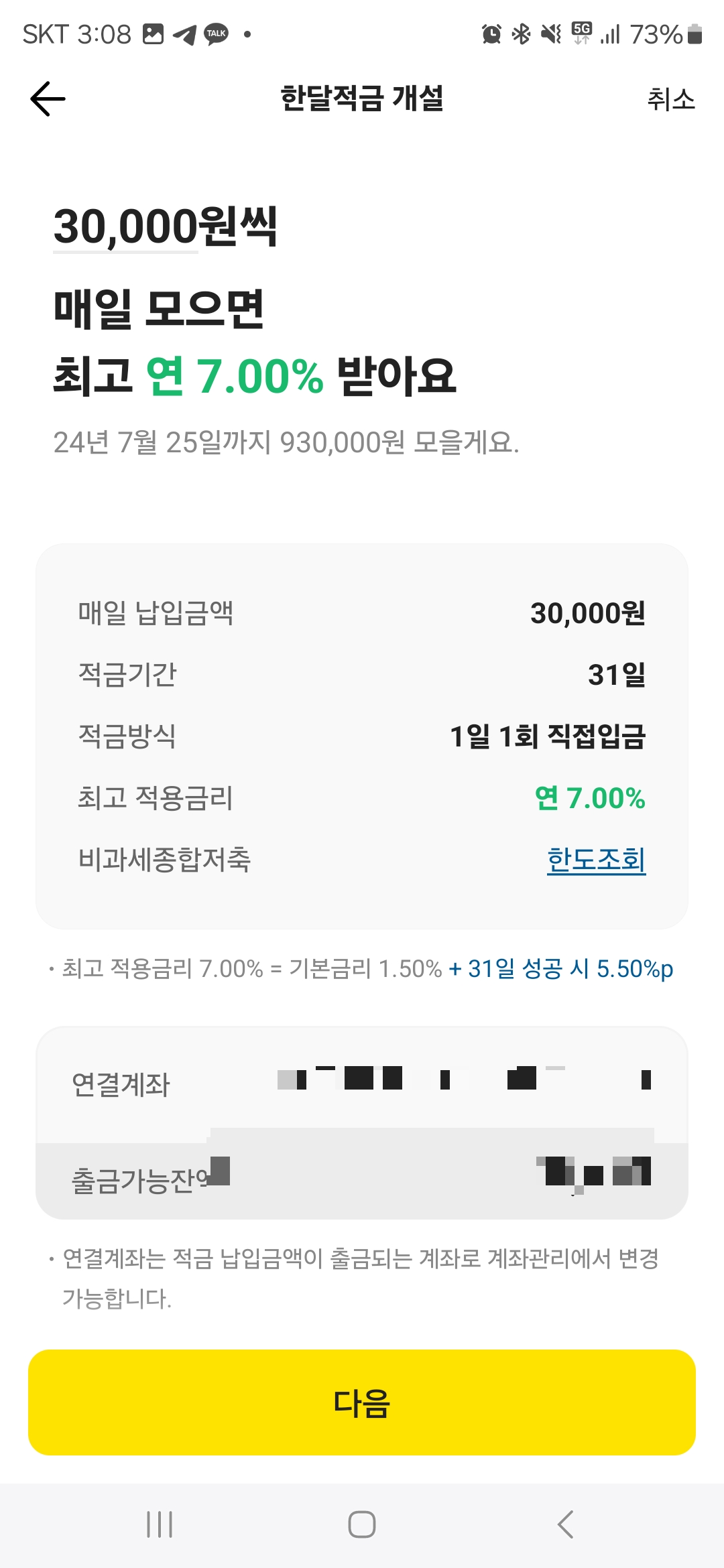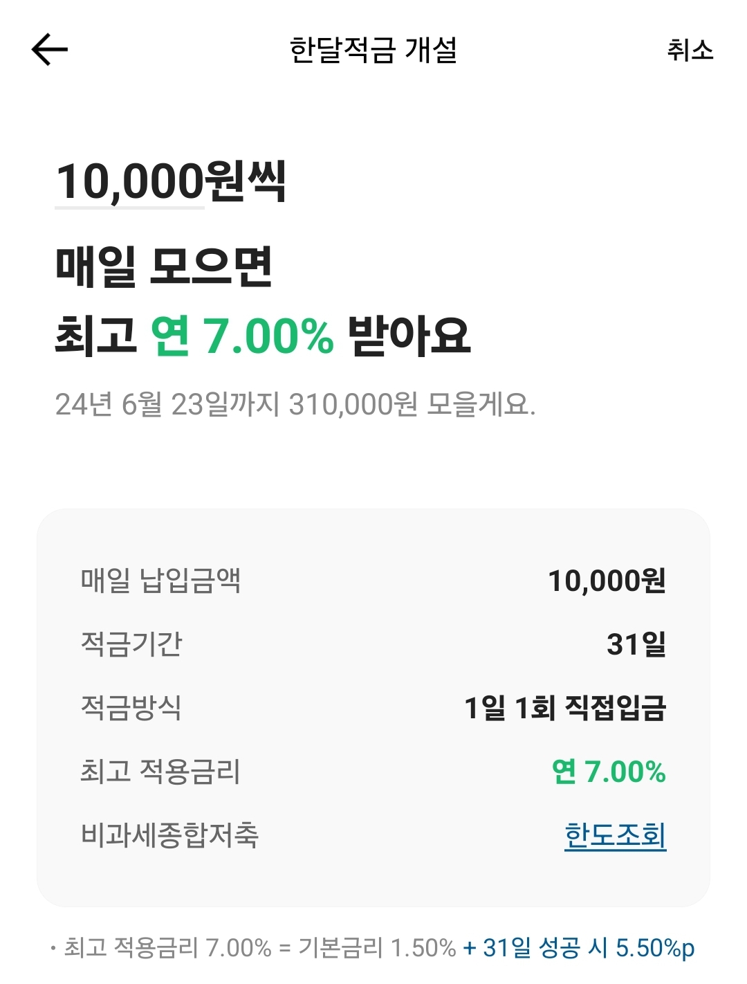 24년 6월23일 까지 310,000원 을 모을거고 최고 연 7% 금리를 받습니다.